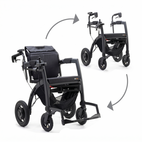 Ein 3-in-1-Rollator, Transportstuhl und elektrischer Rollstuhl, der Nutzer in allen Phasen von Mobilitätseinschränkungen aktiv unterstützt und begleitet.