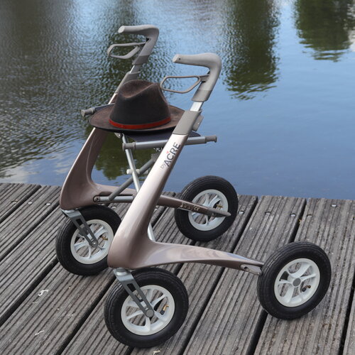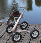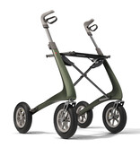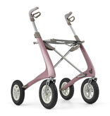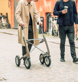 El andador más ligero del mundo también está disponible con neumáticos hinchables. Con un peso total de 6,7 kg y neumáticos blandos, el Carbon Overland es un andador que le permite caminar muy cómodamente por terrenos irregulares. Esto significa que ya no tendrá que arrastrar el andador o, a veces, incluso cargar con él cuando el camino esté demasiado lleno de baches o arena. Y hay otra ventaja: las empuñaduras ergonómicas, que también le ayudan a caminar más recto, pueden ajustarse a una altura de 95 cm. El peso máximo del usuario es de 150 kg.