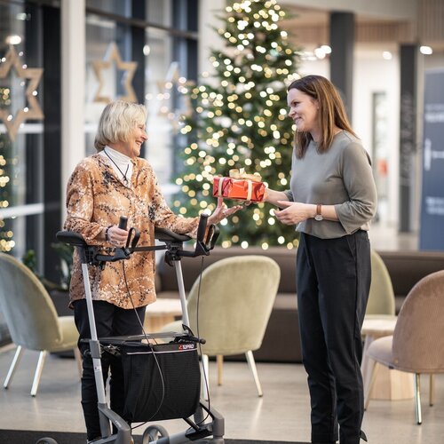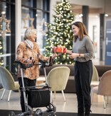 De walker blijft stabiel op zijn vier wielen staan, neemt weinig ruimte in en is ideaal voor gebruik in nauwe doorgangen.